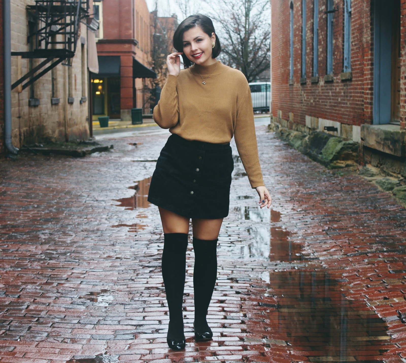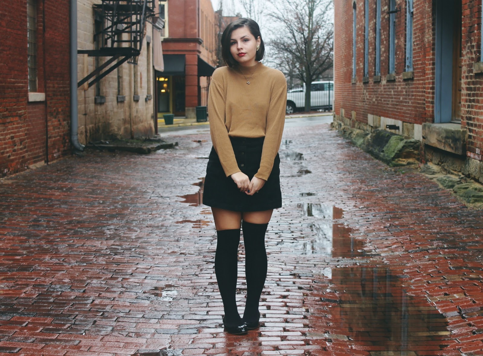 Also, I just love this cute rainy day outfit. You always make over-the-knee socks look so good and that turtleneck sweater looks super comfy.